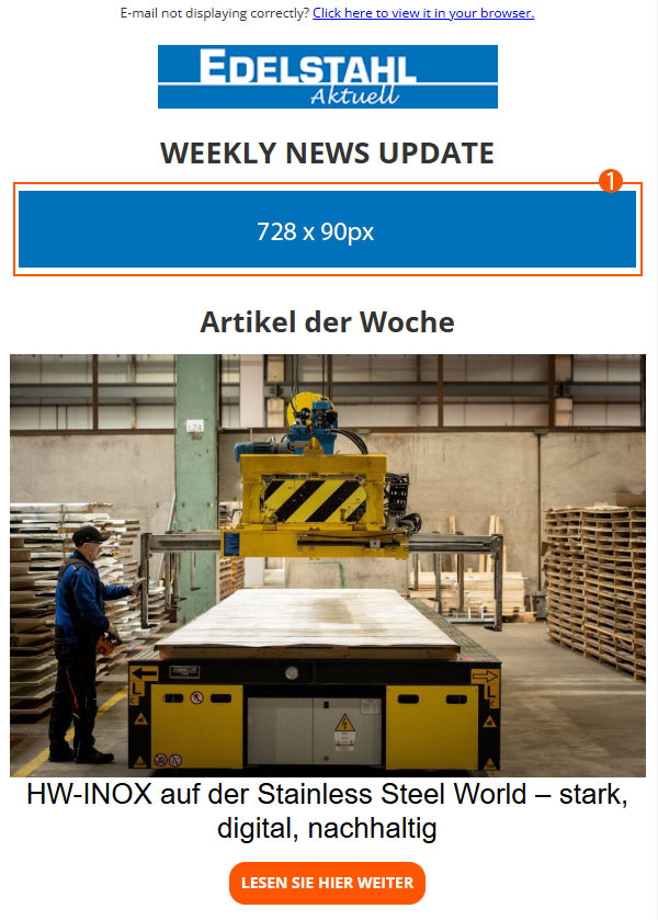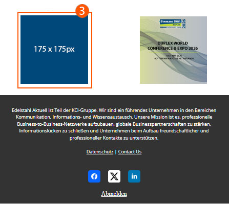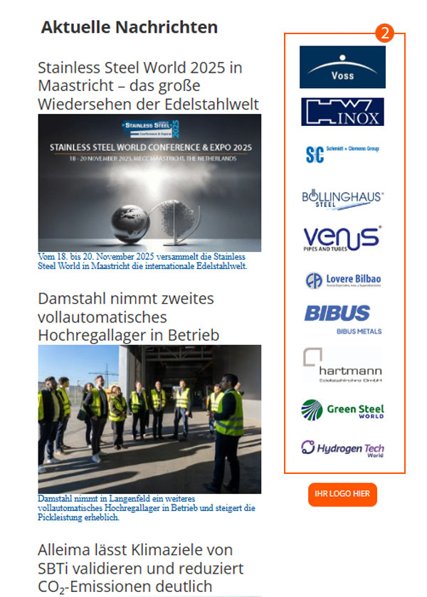 Unser Newsletter mit den aktuellsten Nachrichten aus der Edelstahlwelt ist das perfekte Medium, um Ihren Bekanntheitsgrad zu steigern. Sie können Ihr Unternehmen einem engagierten Publikum aus Fachleuten und Enthusiasten der Branche vorstellen und potenzielle Kunden direkt in deren Posteingang erreichen.