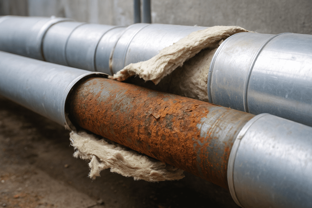 Auch Edelstahl wird in vielen Anlagen isoliert. Gründe sind vor allem die Energieeffizienz, die Arbeitssicherheit und der Schutz vor Kondensatbildung. Eine Dämmung verhindert Wärmeverluste, schützt Mitarbeitende vor heißen Oberflächen und reduziert Kondensat an kalten Leitungen. Unter der Isolierung kann sich jedoch Feuchtigkeit ansammeln, die in Verbindung mit Chloriden zu Korrosion führt. So entsteht das Phänomen der Korrosion unter Dämmung, von dem auch Edelstahl betroffen ist.