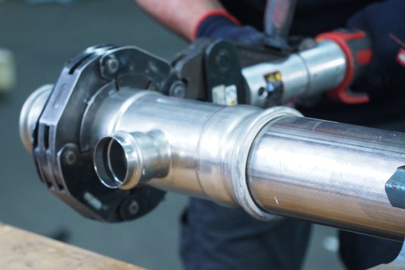 Für die Verbindungstechnik setze SANHA auf die combipress® Technologie. Damit ließen sich alle NiroTherm®-F Fittings bis 54 mm mit den Presskonturen SA, V und M verarbeiten. Ein Wechsel der Pressbacken sei nicht erforderlich, was die Flexibilität und den Zeitaufwand auf der Baustelle reduziere.