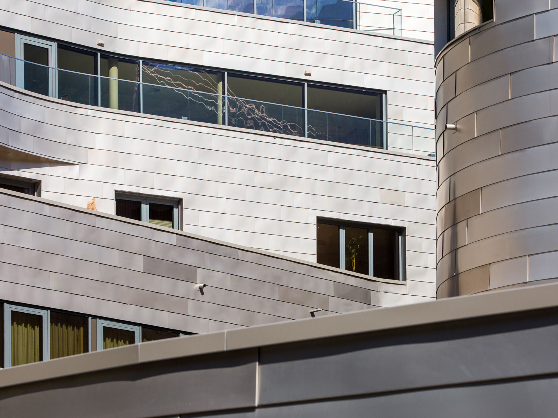 Die Qualität einer Metallfassade entsteht nicht im Entwurf, sondern in der Ausführung. HFX Edelstahl zeigt eine hohe Kantenstabilität und lässt sich präzise formen. Löten ermöglicht dichte, schlanke Stöße mit minimaler Überdeckung – ideal für ein homogenes Fassadenbild. Die matte Oberfläche verlangt saubere Abläufe, Schutzfolien und definierte Transportwege. Montage und Detailausbildung folgen klaren Sequenzen. Jede Naht, jede Fuge zählt. Die Oberfläche streut das Licht gleichmäßig, jede Abweichung wäre sichtbar. Präzision wird so zum sichtbaren Teil der Gestaltung.