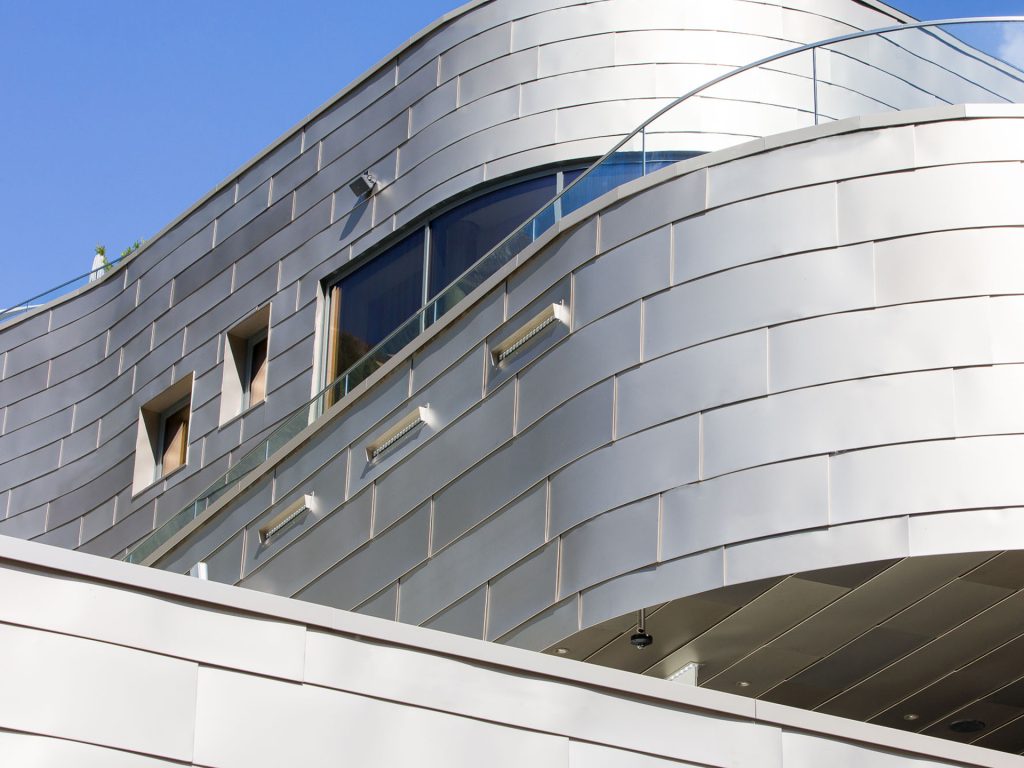 Im Mittelpunkt des Entwurfs steht das Wasser mit all seinen Formen – Bewegung, Strömung, Aggregatszustände. Die geschwungene Gebäudehaut übersetzt diese Idee in Metall. Das Gelände fällt ab, die Berge rahmen den Ort. Eine Fassade, die in jeder Jahreszeit Bestand hat, verlangt ein Material mit kontrollierter Oberflächenwirkung, hoher Beständigkeit und präziser Detaillierung. Hier beginnt die Geschichte der Materialwahl.